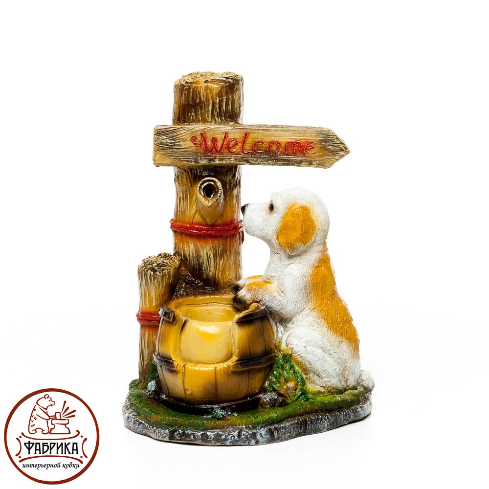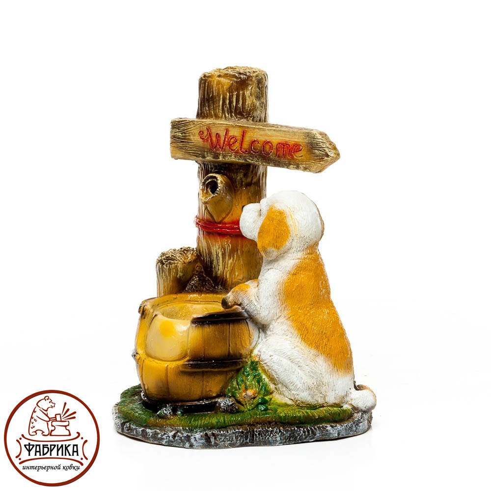 Декоративный фонтан с собачкой изготовлен из полистоуна. Работает от сети 220v. Фонтаны оснащен помпой, с помощью которой происходит циркуляция воды. Для установки и подключения необходимы электричество и вода.