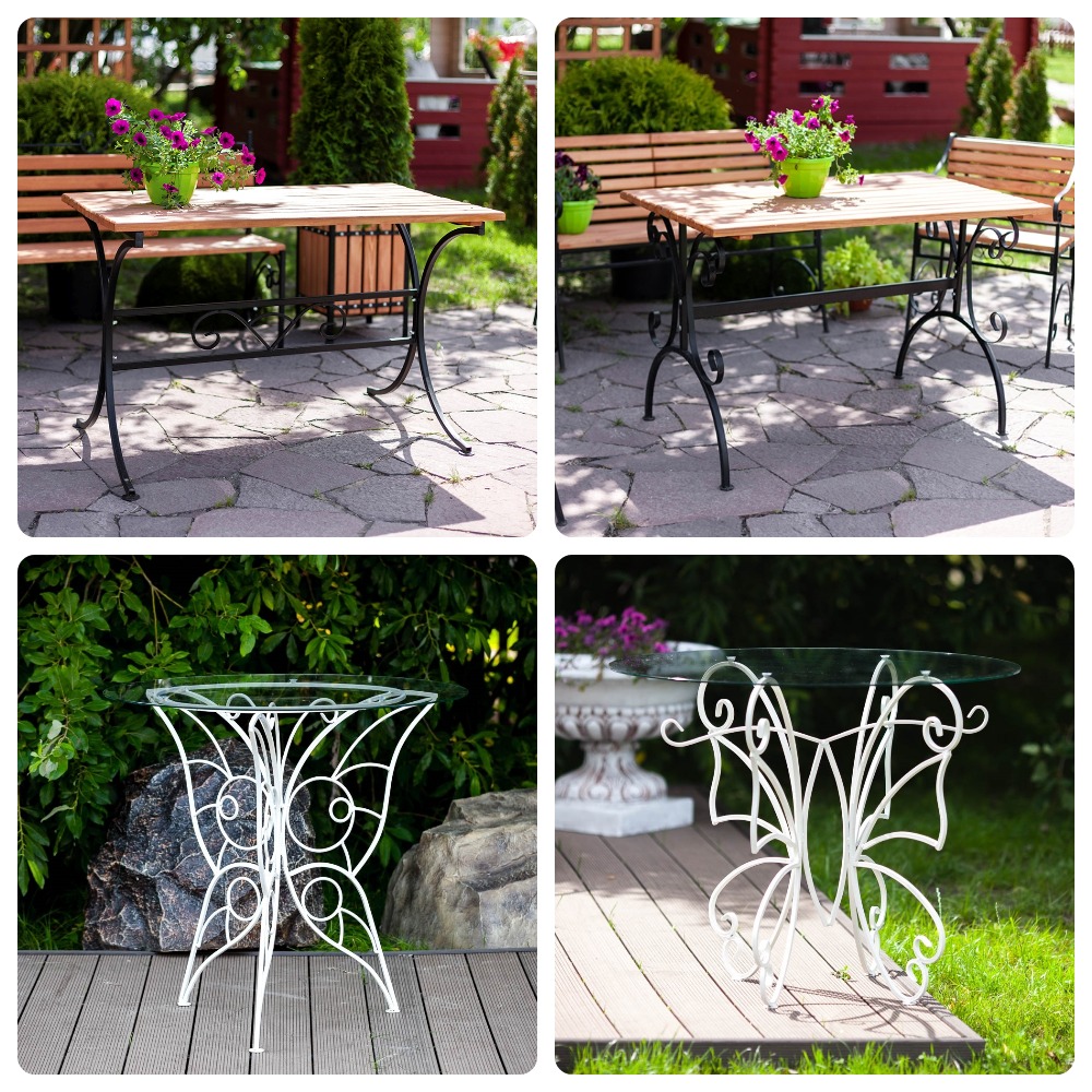 - Кованые столы для сада с подстольями различного дизайна. Столешницы изготавливаются из сосны натурального, белого цвета и оттенка состаренного дерева. Предлагаются столы круглой и прямоугольной формы различных размеров.