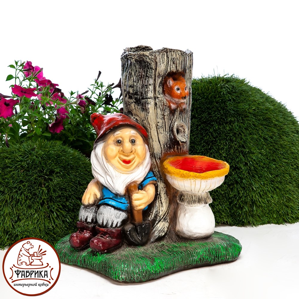 Декоративный фонтан с гномом. Материал изготовления: стеклопластик. Предназначен для установки на садовом или дачном участке. Для подключения и установки необходимы электичество и вода. Работает от сети 220V.