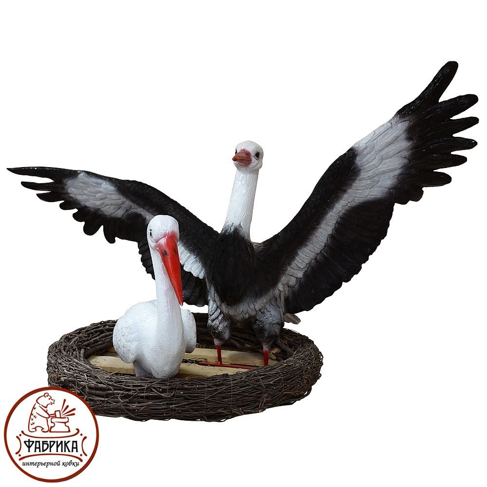В комплект входит два аиста и гнездо. Фигуры аистов изготовлены из полистоуна, гнездо изготавливается из веток натурального дерева, закрепляется по окружности.
