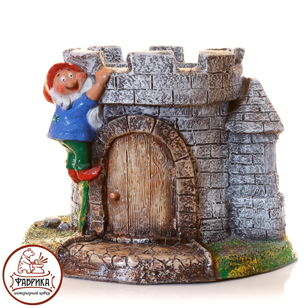 Кашпо для цветов гном с замком изготовлен из стеклопластика. Яркая покраска делает кашпо настоящей изюминкой сада. В кашпо сажают уличные цветы, которые легки в уходе. Такое кашпо можно поставить у входа в дом, рядом с беседкой или рядом с детской площадкой.