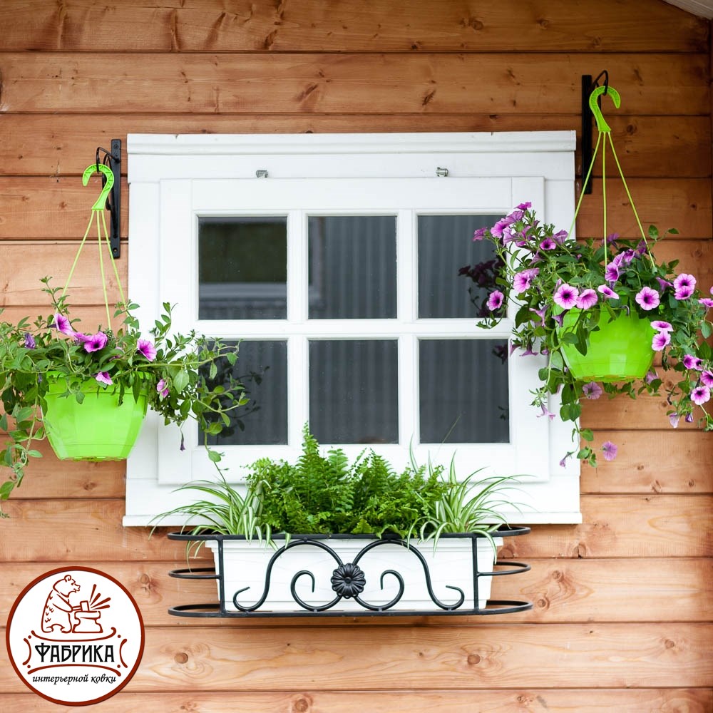Подставка за окно для цветов изготовлена из металла и украшена изящными коваными деталями. Крепится с помощью шурупов к вертикальной поверхности.