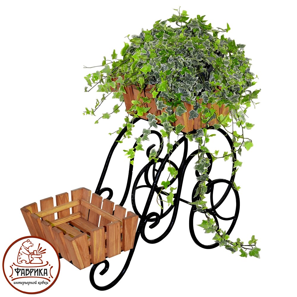 Основу конструкции садовой подставки 59-402 составляет, кованый металлический каркас  и деревянные кадки для подставки растений. Металл покрашен в чёрный цвет а дерево имеет естественный сосновый оттенок. Выгодная оптовая цена, возможна поставка крупным и мелким оптом.