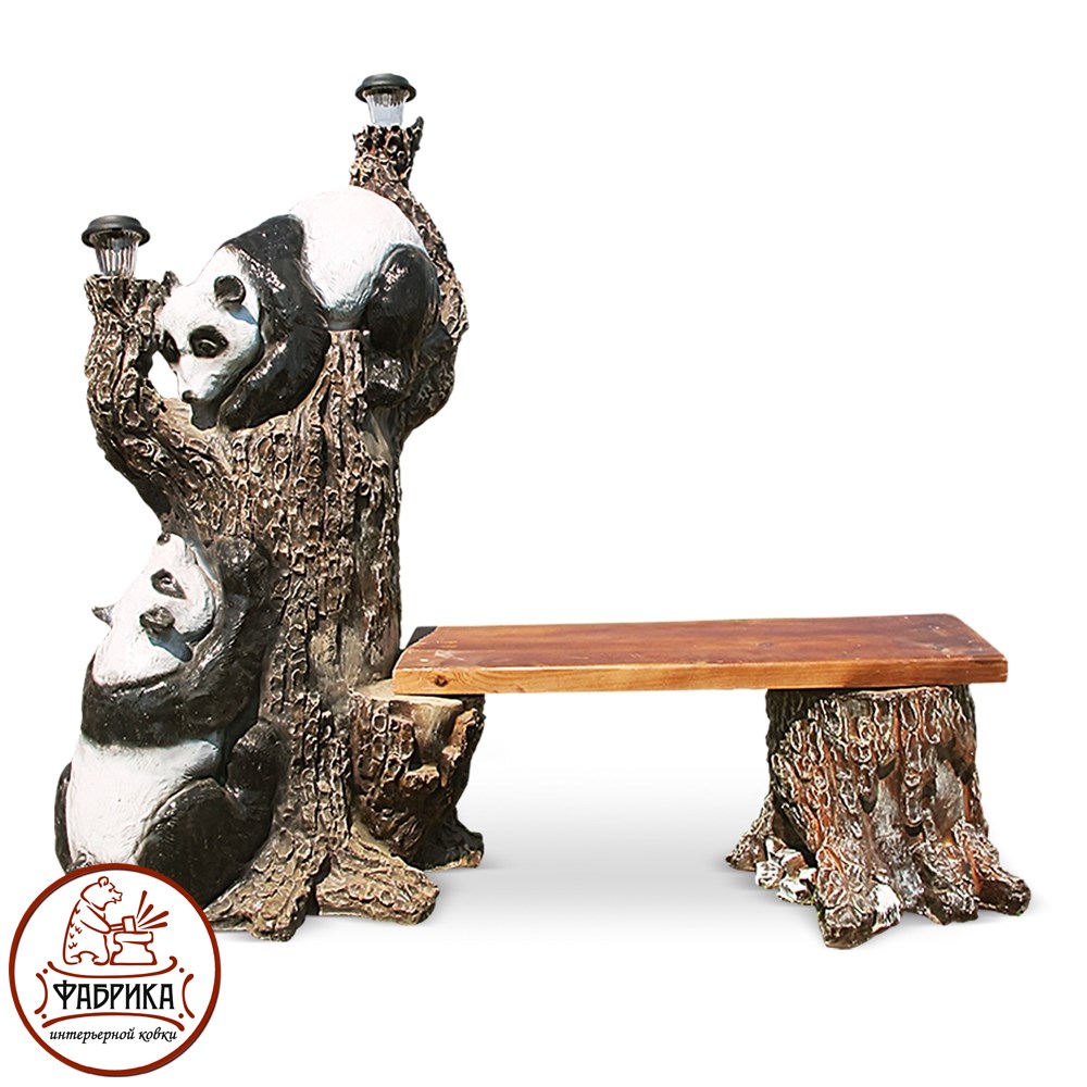 Панды на дереве. Скамейка изготовлена из стеклопластика. Состоит из двух декоративных оснований и лавочки. Главное отличие в оригинальном дизайне и высокой прочности изделия, а также используется для дополнительного освещения садового участка в вечернее время. Скамейка идеально впишется в общий вид вашего садового участка и станет любимым местом для игр ваших детей.